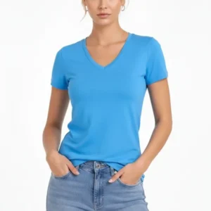 T-Shirt V Yaka Slim Fit Likralı Tişört Günlük Basic Body – Açık Mavi