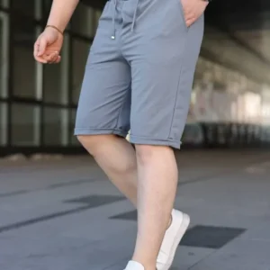 Erkek Diagonel Kumaş Duble Paça Cepli Bağcıklı Bel Lastikli ŞORT – Gri