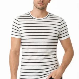 Erkek Çizgili Yazlık Triko T-Shirt Slim Fit Dar Kesim Body Bisiklet Yaka – Beyaz