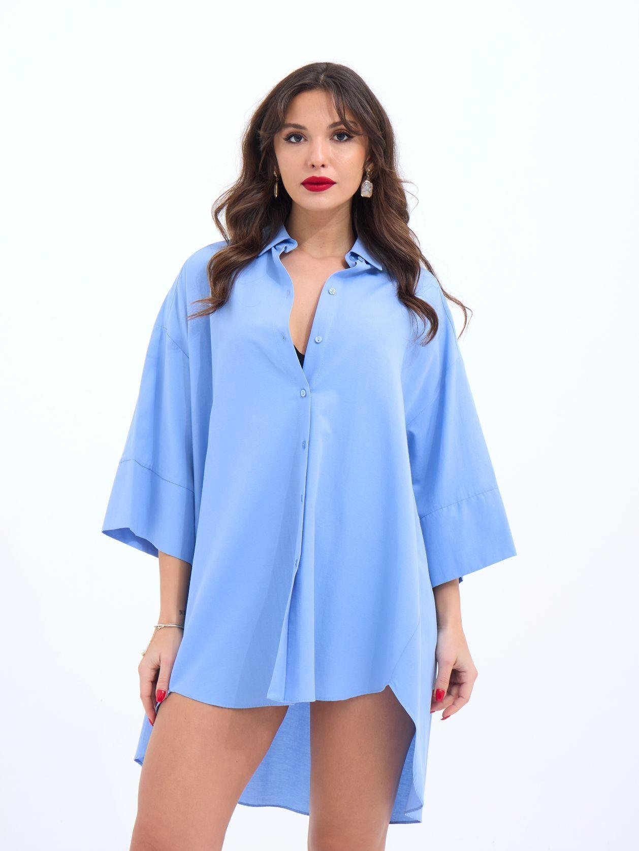 4328 GÖMLEK-MAVİ Modelin Ölçüleri: Boy:165, Kg:55, Göğüs:90, Bel:72, Kalça: 100 Modelin üzerindeki ürün M/38 bedendir