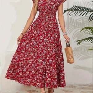 Kadın Kısa Kollu Kruvaze Yaka Beli Lastikli çiçek Desenli Elbise