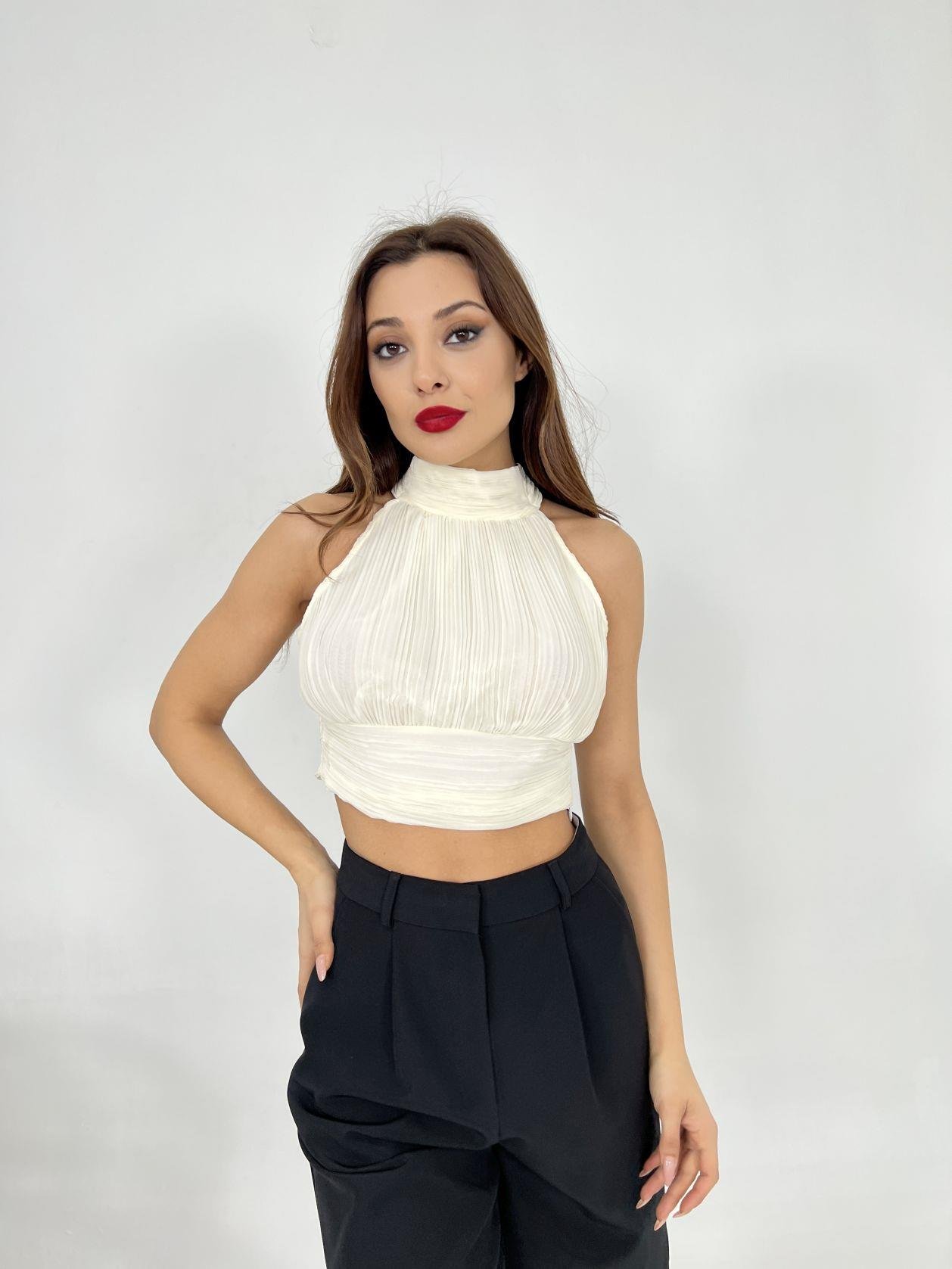 6561 BLUZ-EKRU Modelin Ölçüleri: Boy:165, Kg:55, Göğüs:90, Bel:72, Kalça: 100 Modelin üzerindeki ürün M/38 bedendir