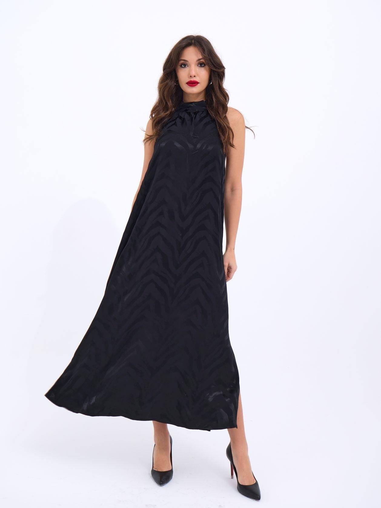 Kadın Askılı Yakası Fırfırlı Bağcıklı Desenli Uzun Süprem Elbise