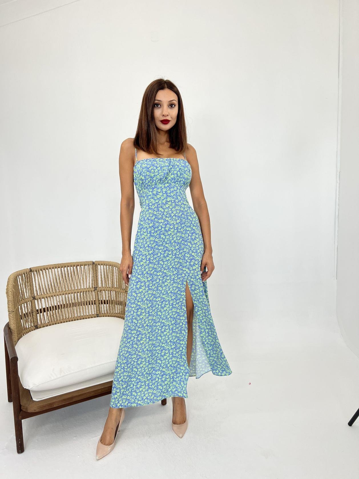 Kadın Askılı Yakası Fırfırlı Bağcıklı Desenli Uzun Süprem Elbise