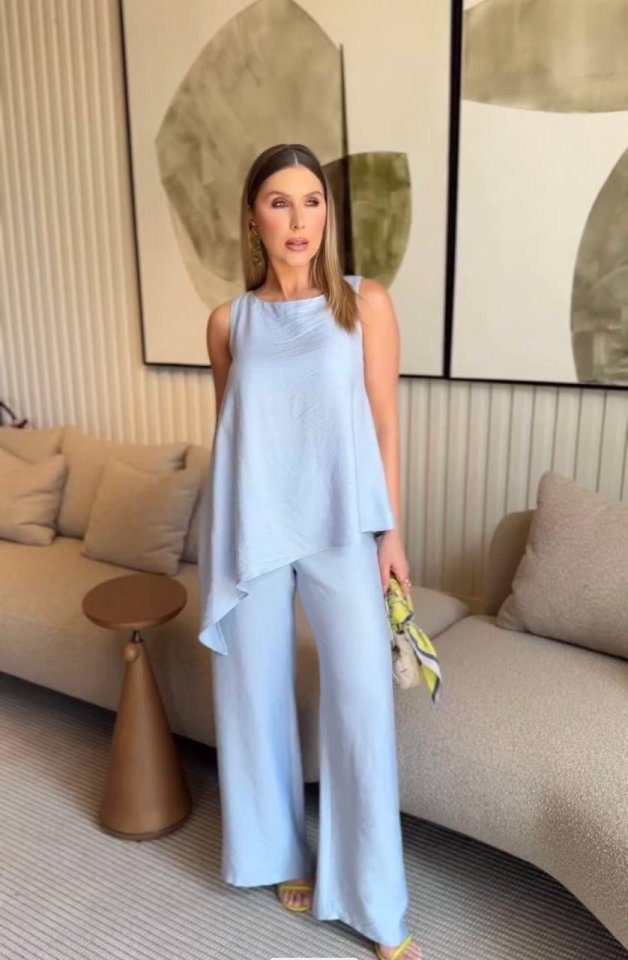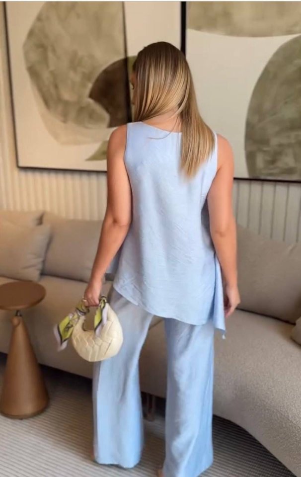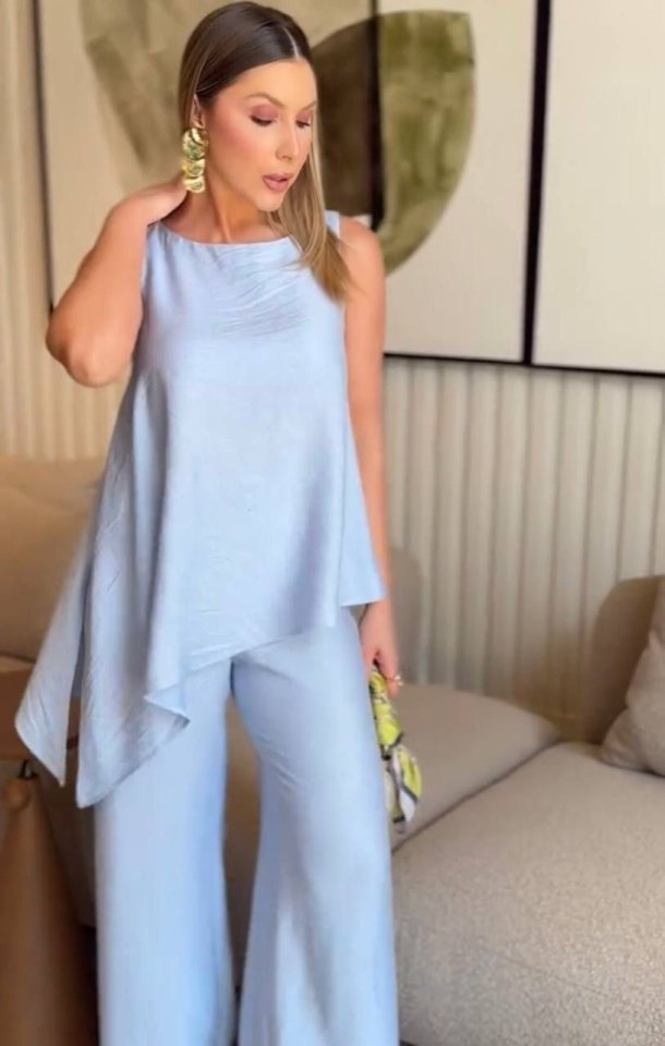 Asimetrik Bluz – Pantolon İkili Takım Modelin Ölçüleri: Boy:165, Kg:55, Göğüs:90, Bel:72, Kalça: 100 Modelin üzerindeki ürün M/38 bedendir