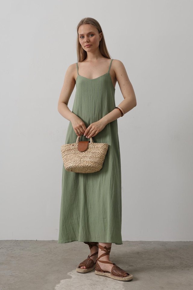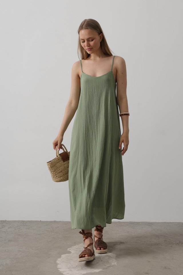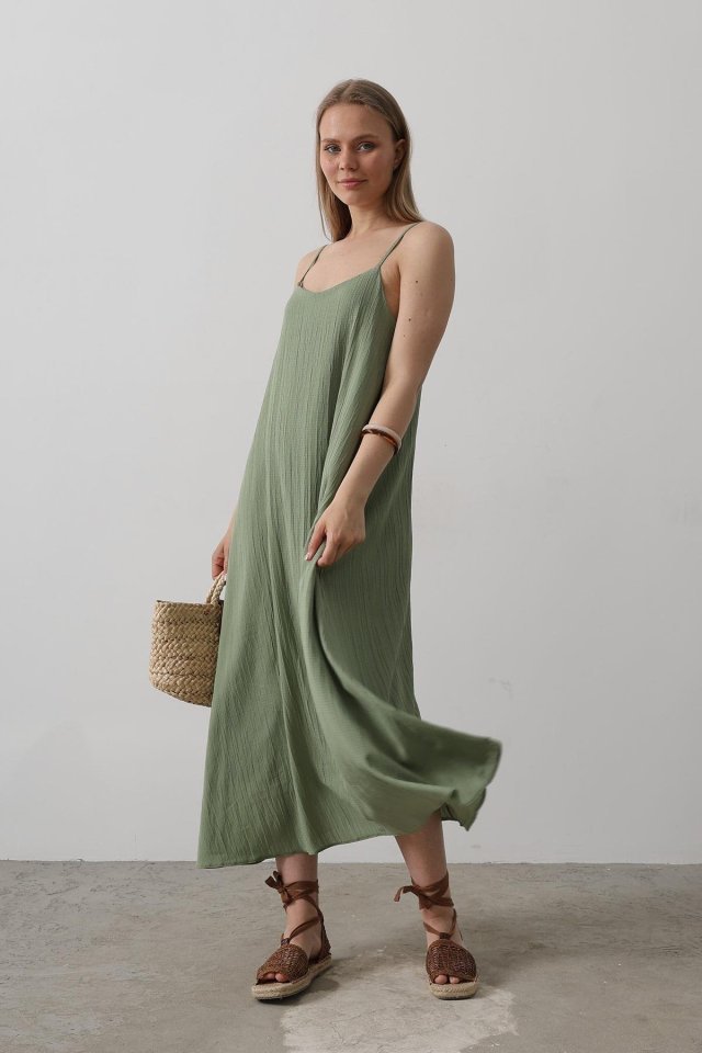 Askılı Uzun Çan Elbise – Haki Modelin Ölçüleri: Boy:165, Kg:55, Göğüs:90, Bel:72, Kalça: 100 Modelin üzerindeki ürün M/38 bedendir
