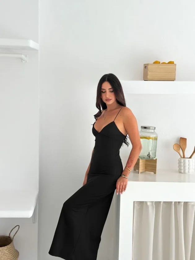 Askılı Uzun Elbise V Yaka Şık Gece Elbisesi Vücuda Oturan – Siyah Modelin Ölçüleri: Boy:165, Kg:55, Göğüs:90, Bel:72, Kalça: 100 Modelin üzerindeki ürün M/38 bedendir