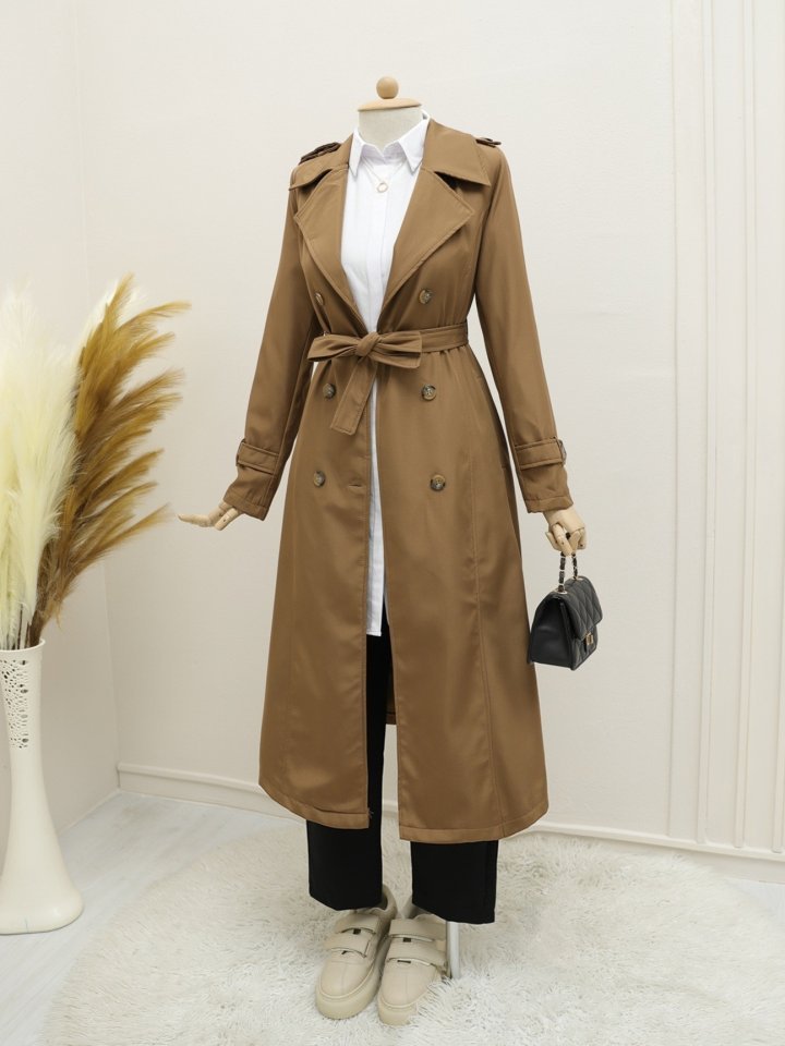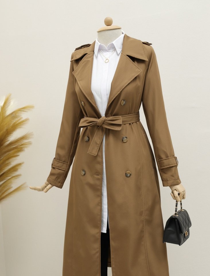 Astarlı Kemerli Trenckot -Taba Modelin Ölçüleri: Boy:165, Kg:55, Göğüs:90, Bel:72, Kalça: 100 Modelin üzerindeki ürün M/38 bedendir