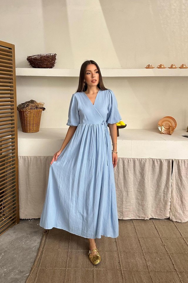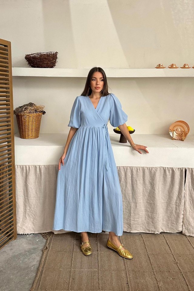 Bebe Mavi Müslin Uzun Elbise Modelin Ölçüleri: Boy:165, Kg:55, Göğüs:90, Bel:72, Kalça: 100 Modelin üzerindeki ürün M/38 bedendir