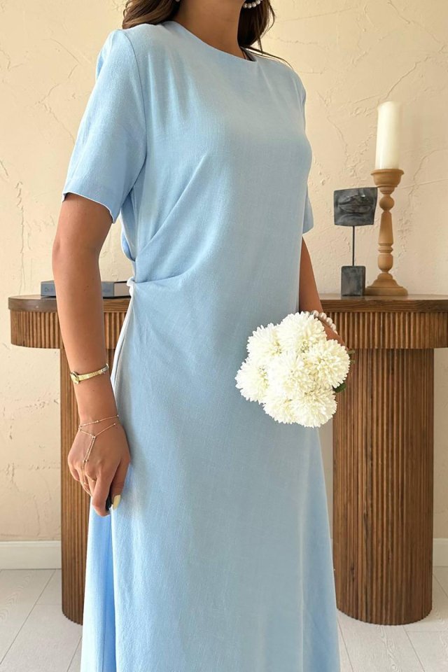 Bebe Mavi Pileli Bisiklet Yaka Elbise Modelin Ölçüleri: Boy:165, Kg:55, Göğüs:90, Bel:72, Kalça: 100 Modelin üzerindeki ürün M/38 bedendir