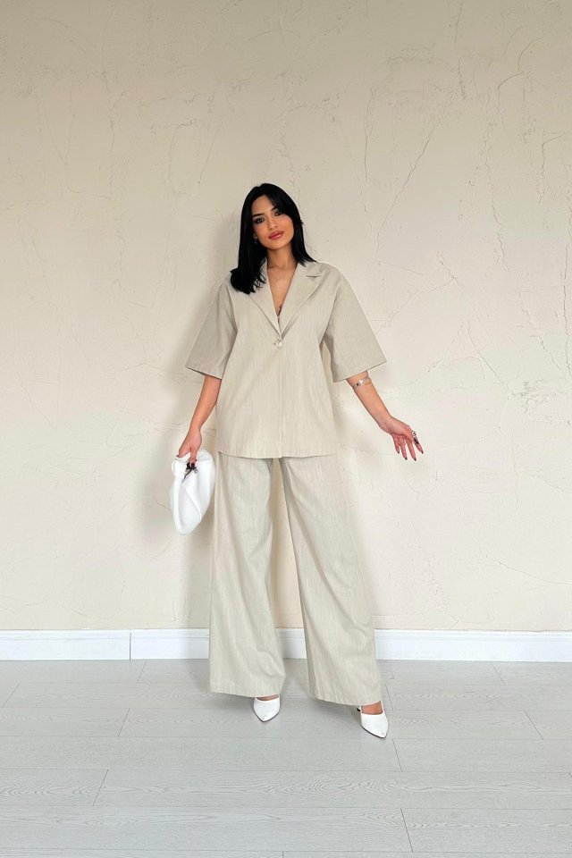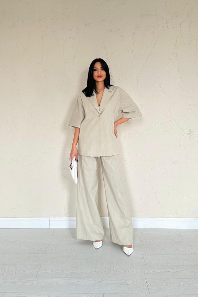 Bej Önü Tek Düğmeli Ceket Pantolon Takım Modelin Ölçüleri: Boy:165, Kg:55, Göğüs:90, Bel:72, Kalça: 100 Modelin üzerindeki ürün M/38 bedendir
