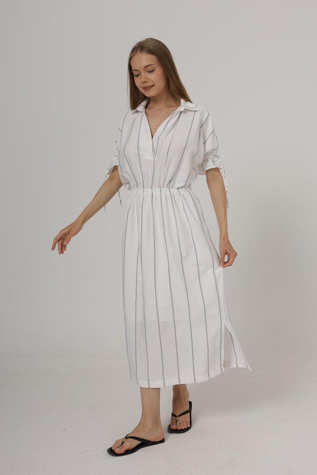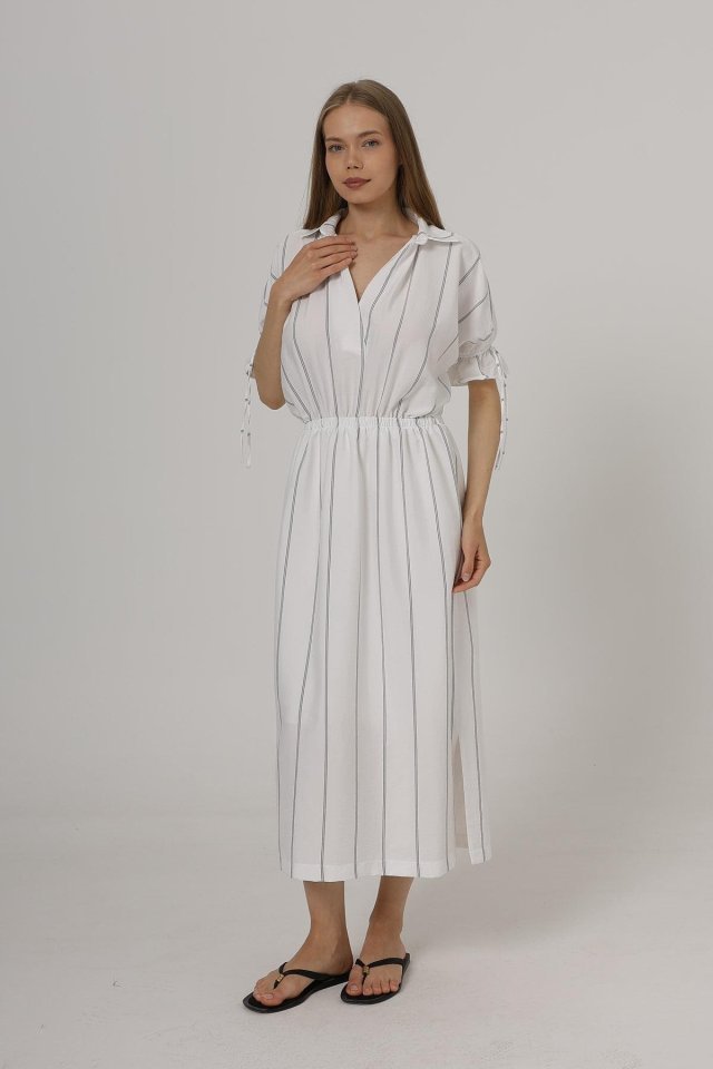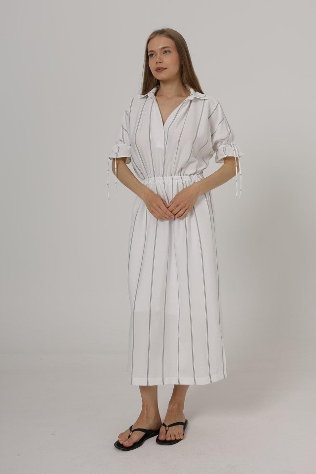 Beli Lastikli Elbise – Beyaz Modelin Ölçüleri: Boy:165, Kg:55, Göğüs:90, Bel:72, Kalça: 100 Modelin üzerindeki ürün M/38 bedendir
