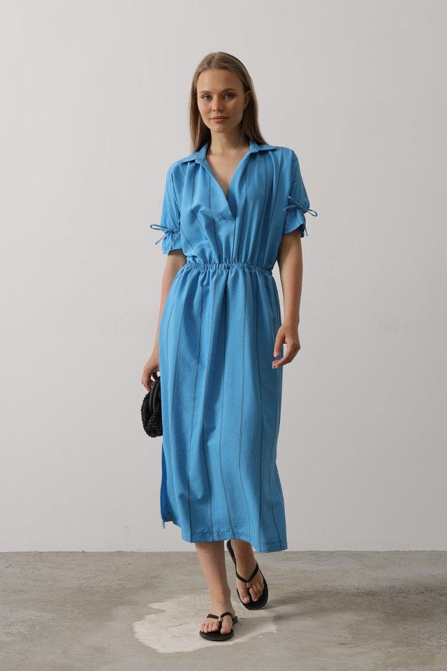 Beli Lastikli Elbise – Mavi Modelin Ölçüleri: Boy:165, Kg:55, Göğüs:90, Bel:72, Kalça: 100 Modelin üzerindeki ürün M/38 bedendir