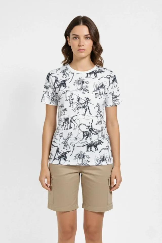 Beyaz Dinozor Desenli Tişört – Regular Kalıp, Bisiklet Yaka, Dijital Baskılı Pamuklu T-Shirt – Beyaz