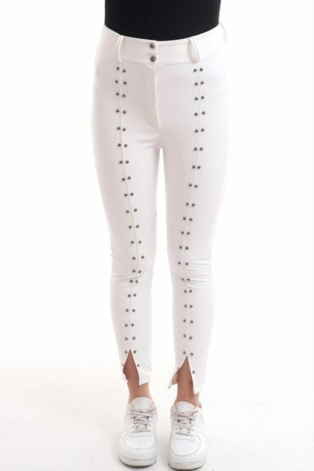 Beyaz Taş İşlemeli Deri Tayt Modelin Ölçüleri: Boy:165, Kg:55, Göğüs:90, Bel:72, Kalça: 100 Modelin üzerindeki ürün M/38 bedendir