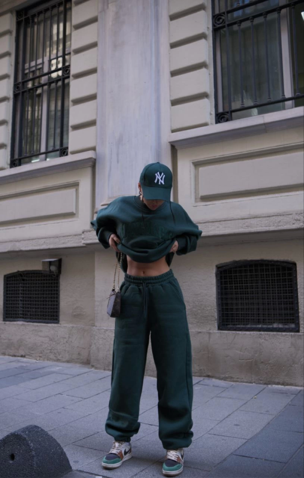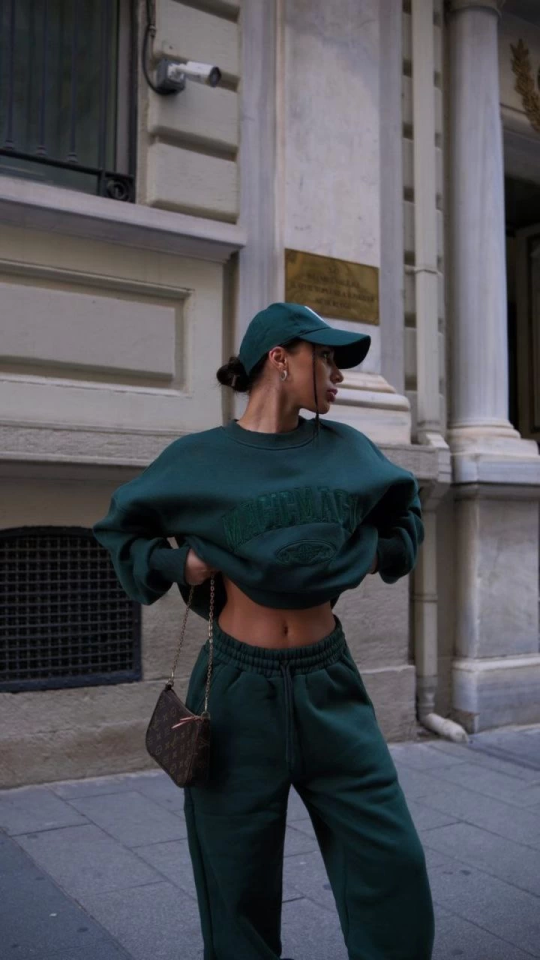 Bisiklet Yaka Nakış İşlemeli Üç İplik Sweat Takım – Yeşil Modelin Ölçüleri: Boy:165, Kg:55, Göğüs:90, Bel:72, Kalça: 100 Modelin üzerindeki ürün M/38 bedendir