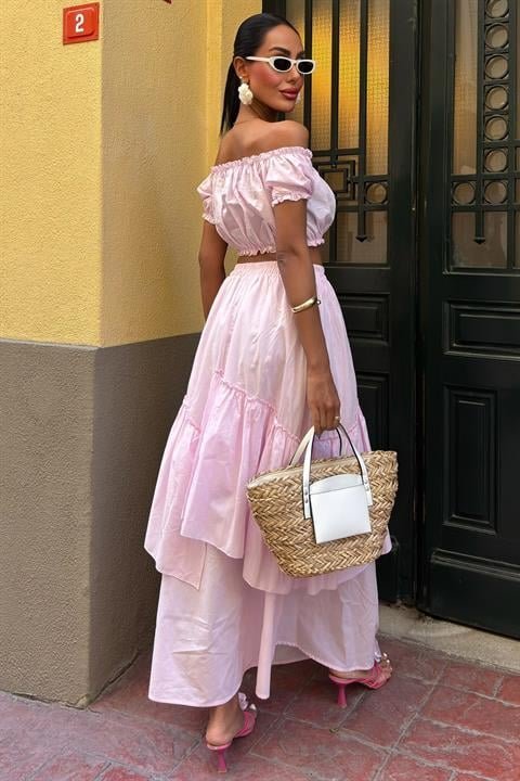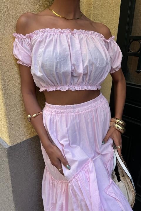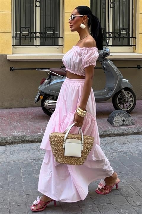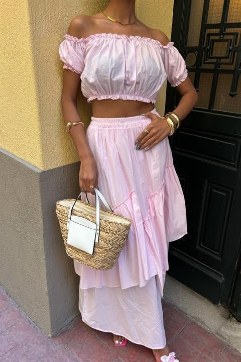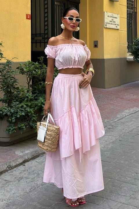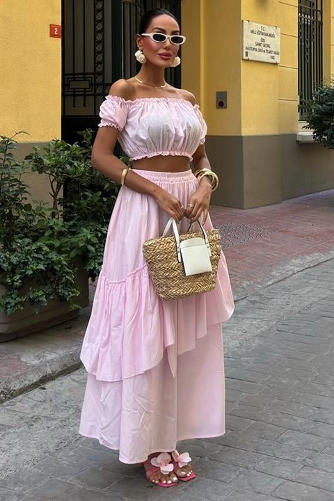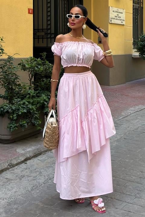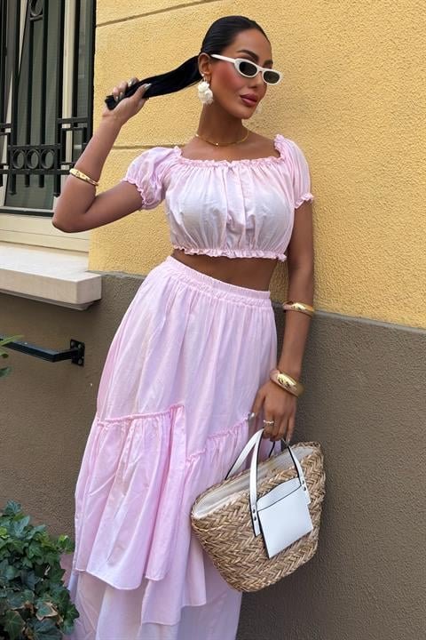 Büzgülü Crop Kat Detaylı Fırfır Etekli Takım 10196