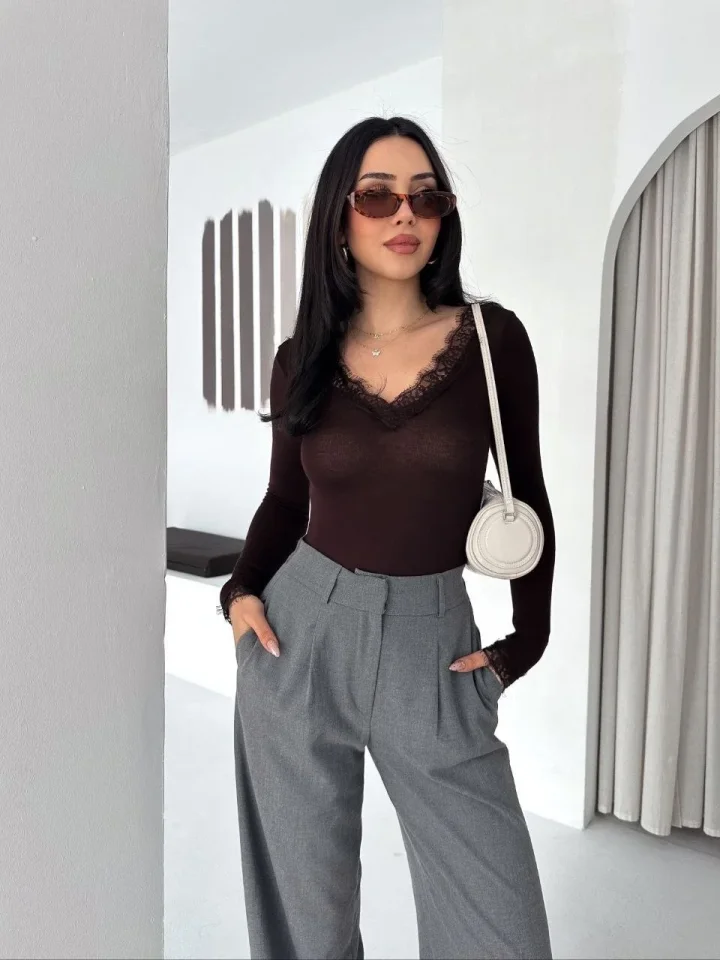 Dantel Detaylı V Yaka Arkası V Yaka Kaşmir Dokulu Uzun Kollu Bluz – Vişne Çürüğü Modelin Ölçüleri: Boy:165, Kg:55, Göğüs:90, Bel:72, Kalça: 100 Modelin üzerindeki ürün M/38 bedendir