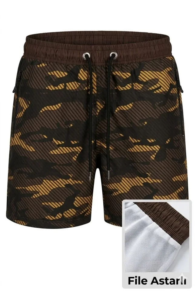 Deniz Şortu Fermuarlı Cepli File Astarlı Hızlı Kuruyan Premium – Kahverengi