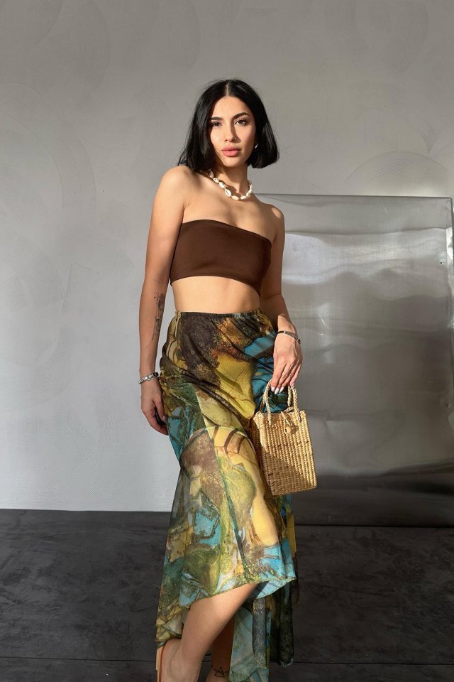 Desenli Baskılı Lastikli Etek Modelin Ölçüleri: Boy:165, Kg:55, Göğüs:90, Bel:72, Kalça: 100 Modelin üzerindeki ürün M/38 bedendir