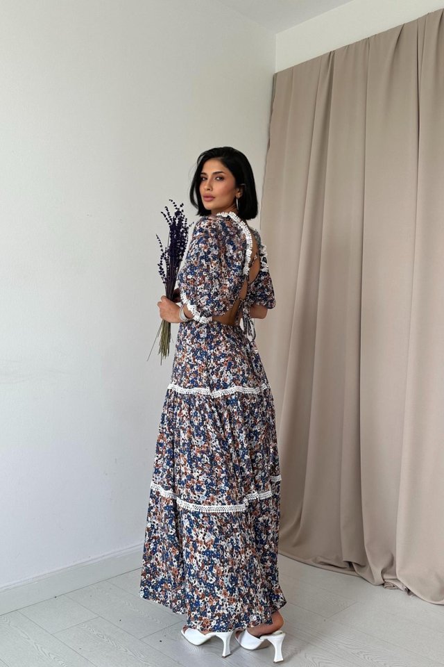 Desenli Sırtı Dekolteli Brode Elbise Modelin Ölçüleri: Boy:165, Kg:55, Göğüs:90, Bel:72, Kalça: 100 Modelin üzerindeki ürün M/38 bedendir