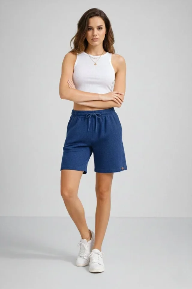 Dokuma Otoban Şort Beli Lastikli Bağcıklı, Cepli, Rahat Kesim Günlük Yazlık Şort – İndigo