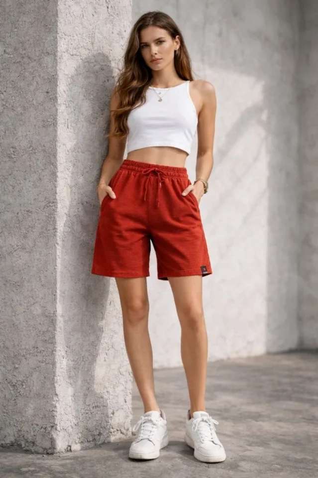 Dokuma Otoban Şort Beli Lastikli Bağcıklı, Cepli, Rahat Kesim Günlük Yazlık Şort – Turuncu