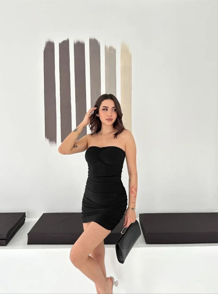 Drapeli Straplez Mini Elbise Esnek Kumaş Vücuda Oturan Gece Elbisesi – Siyah Modelin Ölçüleri: Boy:165, Kg:55, Göğüs:90, Bel:72, Kalça: 100 Modelin üzerindeki ürün M/38 bedendir