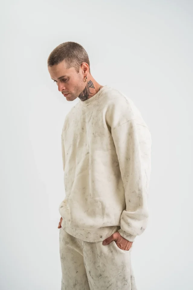 Erkek 3 İplik Pamuklu Yağ Yıkamalı Sweatshirt Double Oversize Bisiklet Yaka Uzun Kol – Krem