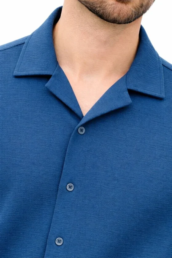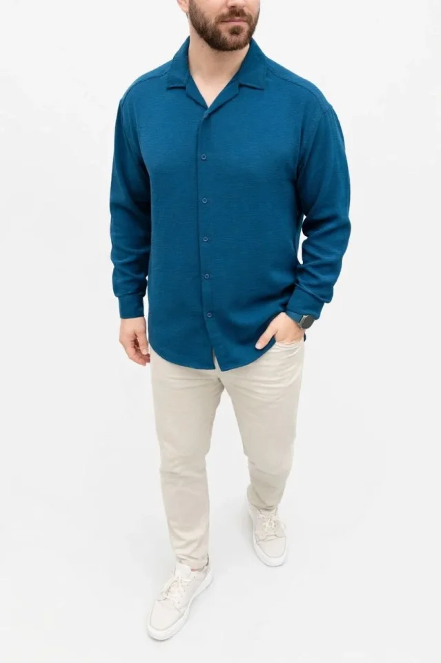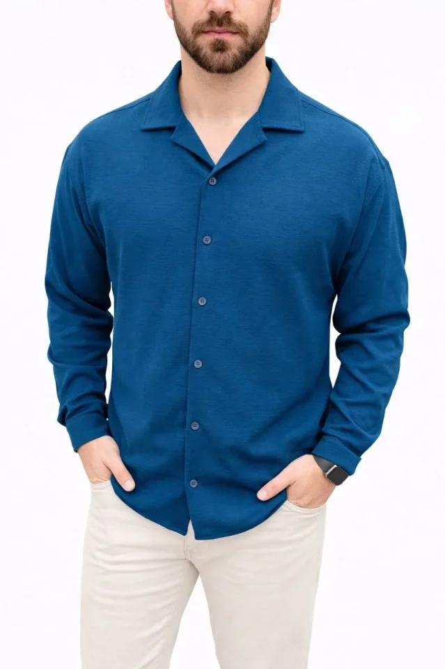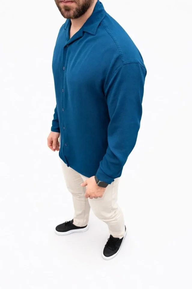 Erkek Aerobin Kumaş Oversize 4 Mevsim Uzun Kollu Rahat Kalıp Gömlek – İndigo