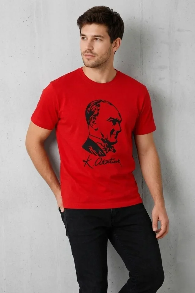 Erkek Atatürk Baskılı Tişört Kısa Kollu Bisiklet Yaka T-Shirt – Kırmızı Modelin Ölçüleri: Boy:165, Kg:55, Göğüs:90, Bel:72, Kalça: 100 Modelin üzerindeki ürün M/38 bedendir