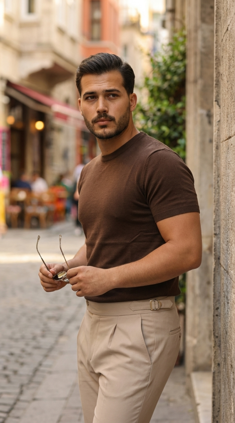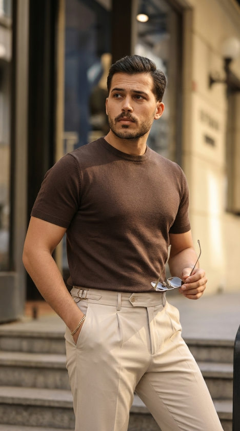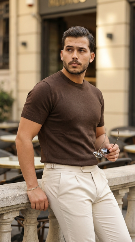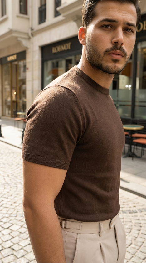 Erkek Basic Bisiklet Yaka Kısa Kollu Triko Tişört – %100 Pamuk Akrilik