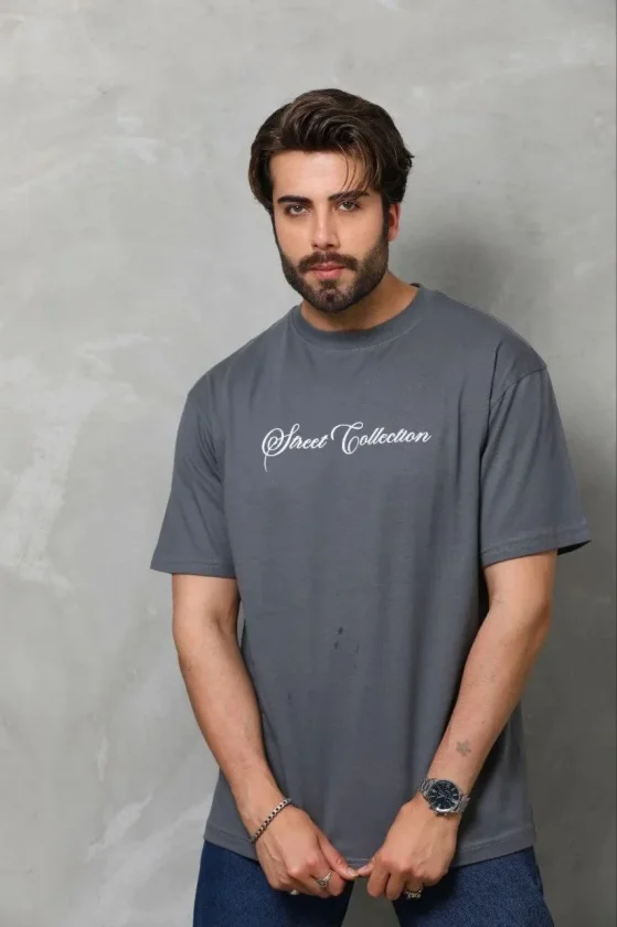 Erkek Baskılı T-Shirt Kısa Kol Bisiklet Yaka Regular Fit Rahat Kalıp Günlük Tişört – Füme