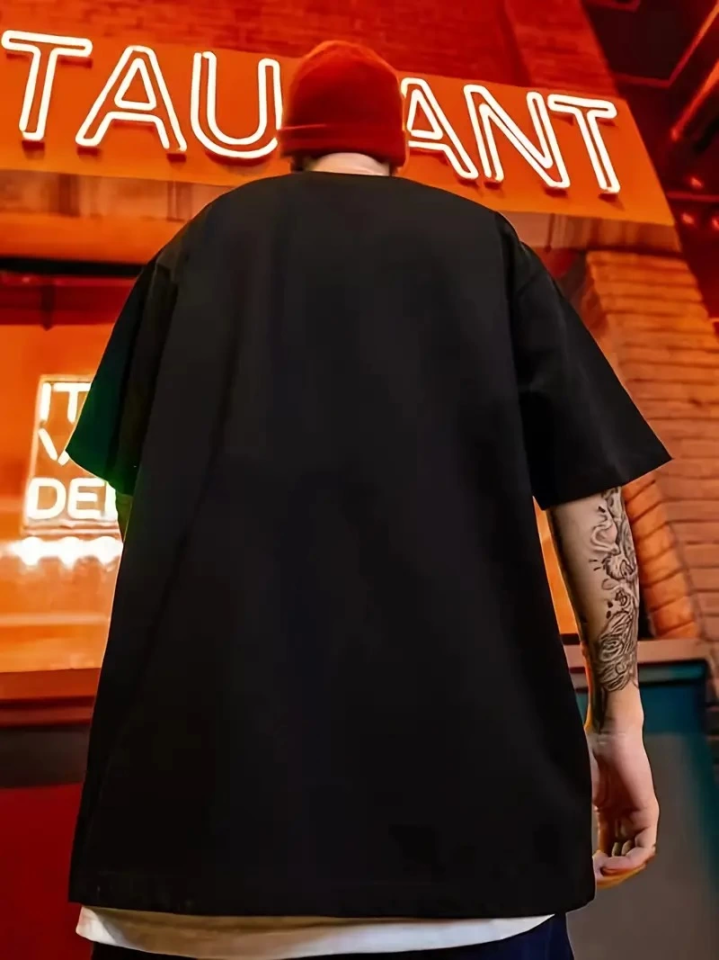 Erkek Büyük Beden Kart Baskılı Düz Renk Kısa Kollu Bisiklet Yaka Tişört Gündelik Giyim – Siyah