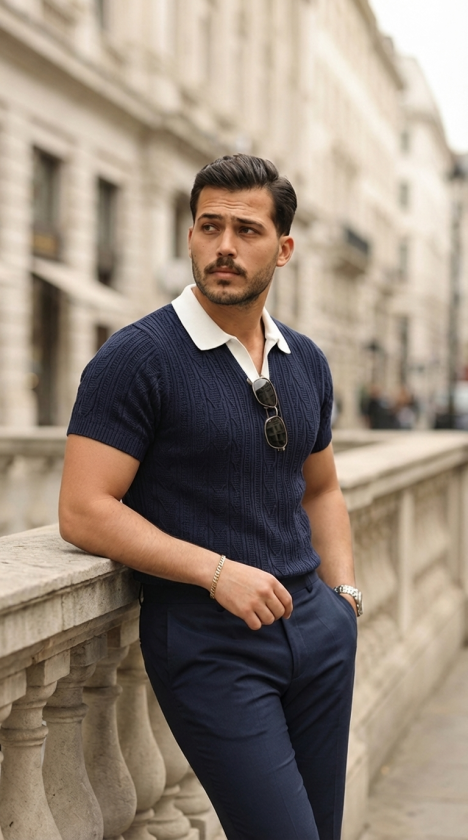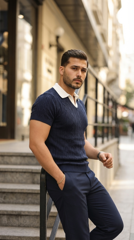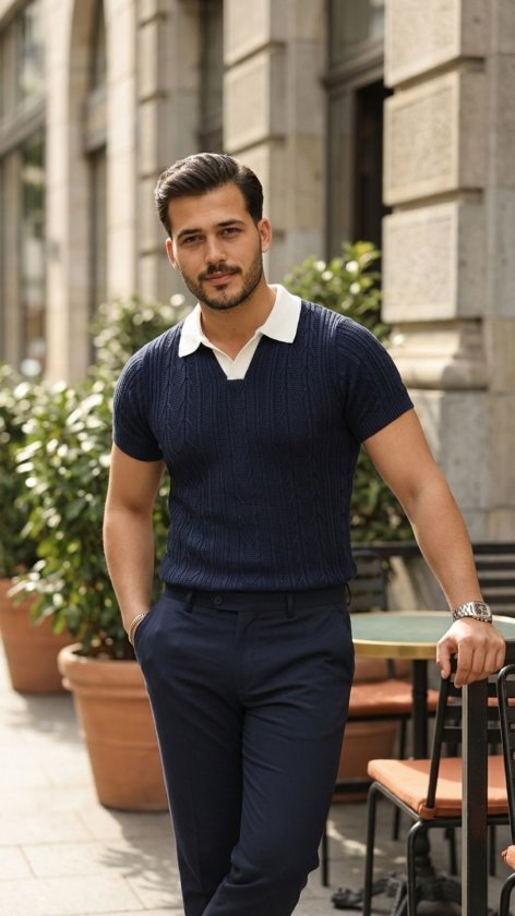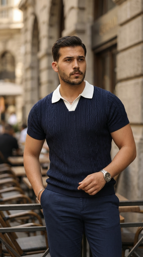 Erkek Örgü Desenli Renkli Kısa Kollu Triko Tişört