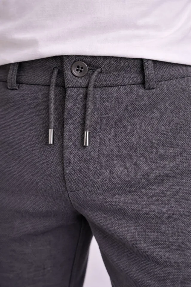 Erkek Diagonel Mikro Dokulu Duble Paça Cepli Pantolon Bağcıklı Bel, Modern Kesim – Füme