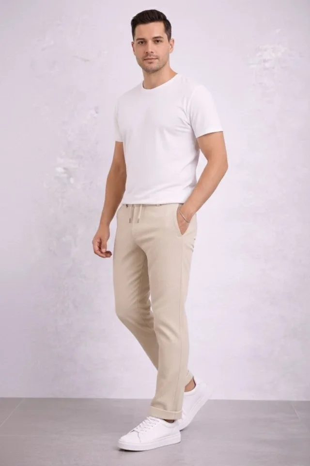 Erkek Diagonel Mikro Dokulu Duble Paça Cepli Pantolon Bağcıklı Bel, Modern Kesim – Krem