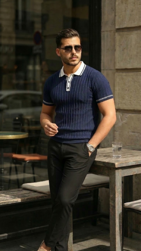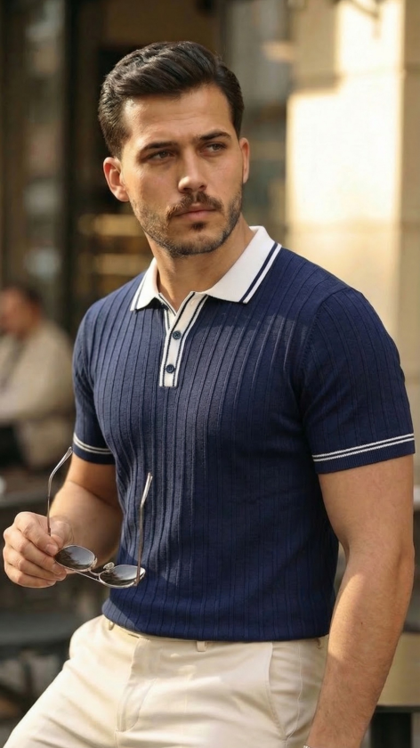 Erkek Düğme Yakalı Kontrast Yaka Triko Tişört