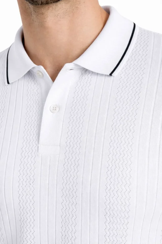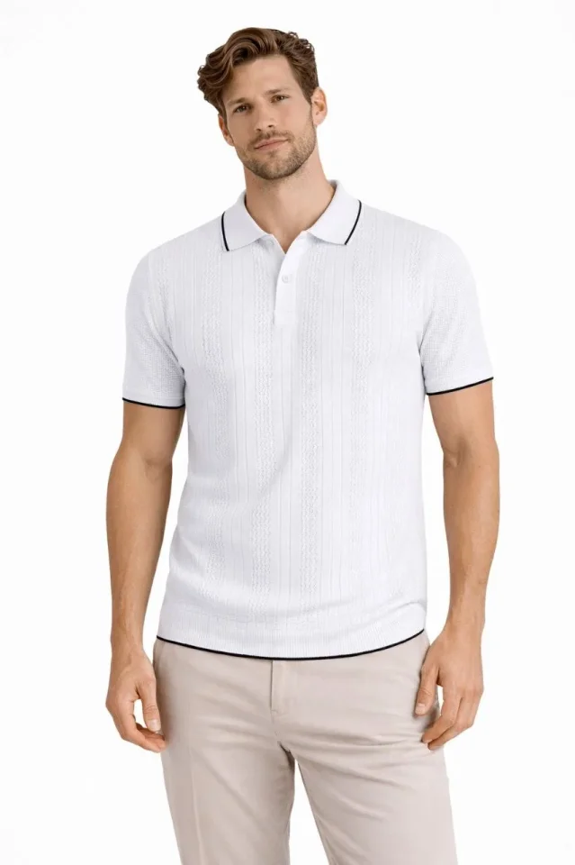 Erkek Düğmeli Yaka Triko Dokuma Tişört Desenli Yazlık Şık Günlük Triko Tişört – Beyaz