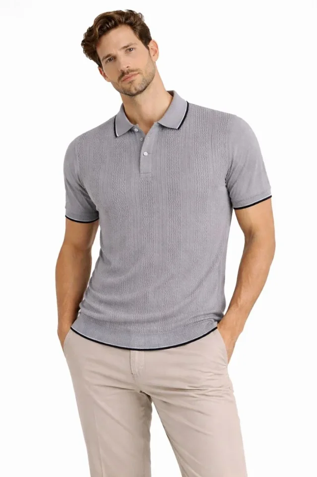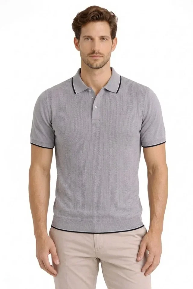 Erkek Düğmeli Yaka Triko Dokuma Tişört Desenli Yazlık Şık Günlük Triko Tişört – Gri