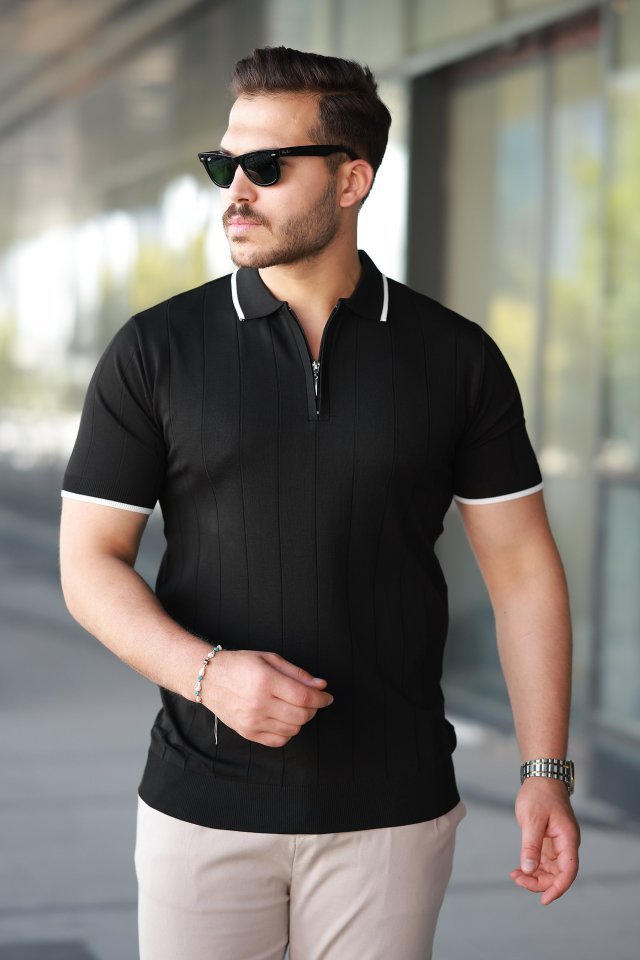 Erkek Fermuar Yakalı çizgi Dokulu Kısa Kollu Tişört