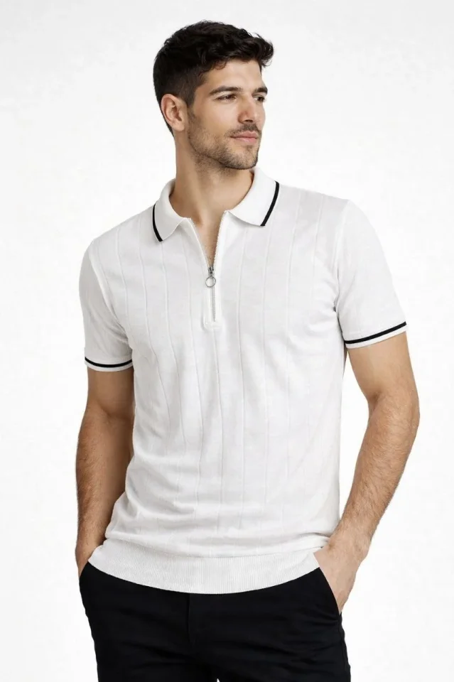 Erkek Fermuarlı Yaka Fitilli Triko Kısa Kollu Regular Fit Tişört T-shirt – Beyaz