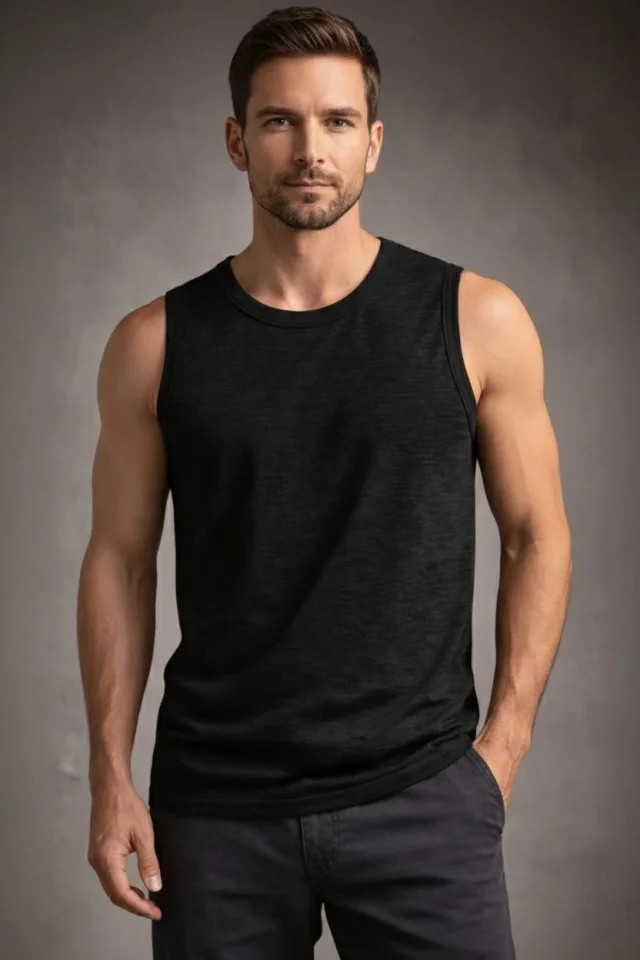 Erkek Flamlı Kumaş Sıfır Kolsuz Atlet Basic Spor Üst, Günlük Ve Fitness Kullanımına Uygun – Siyah