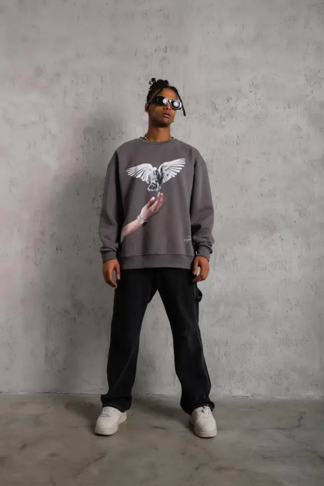 Erkek Güvercin Baskılı Sweatshirt – Gri