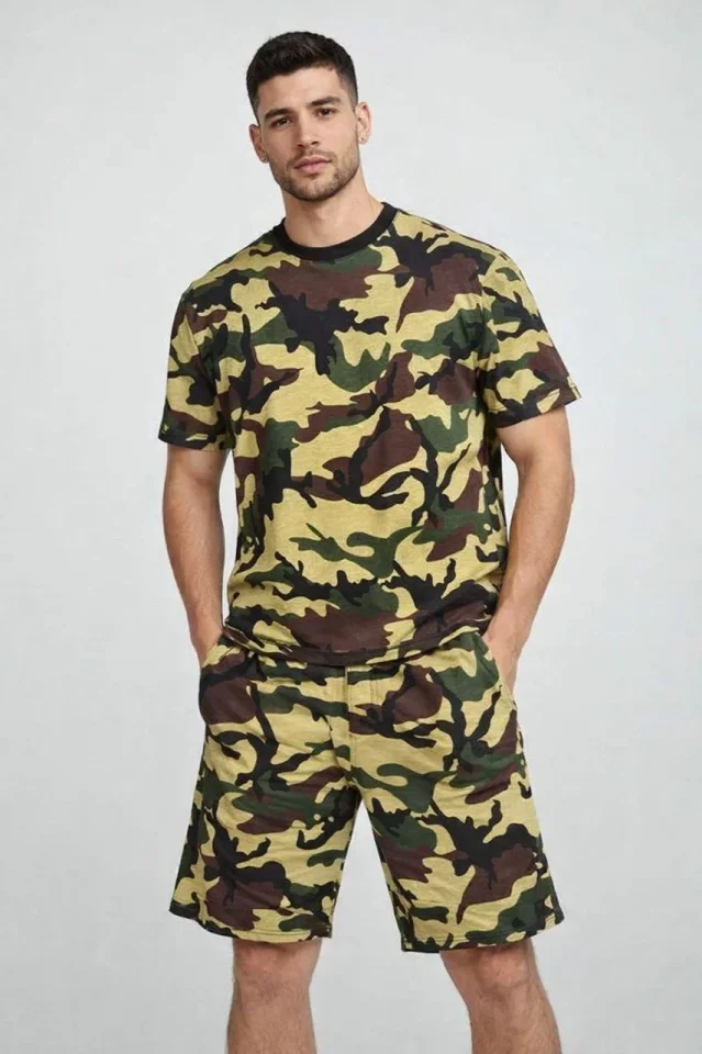 Erkek Kamuflaj Desenli Tişört Şort Takım – Regular Fit Günlük Spor 2’li Yazlık Kombin – Kamuflaj