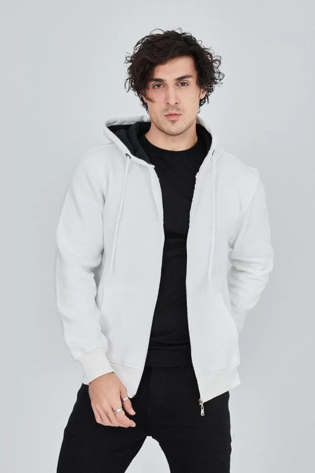 Erkek Kapüşonlu Düz Fermuarlı Hırka – Beyaz