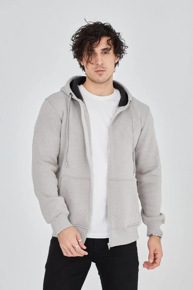 Erkek Kapüşonlu Düz Fermuarlı Hırka – Boyalı Gri