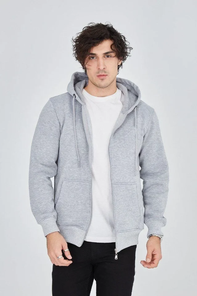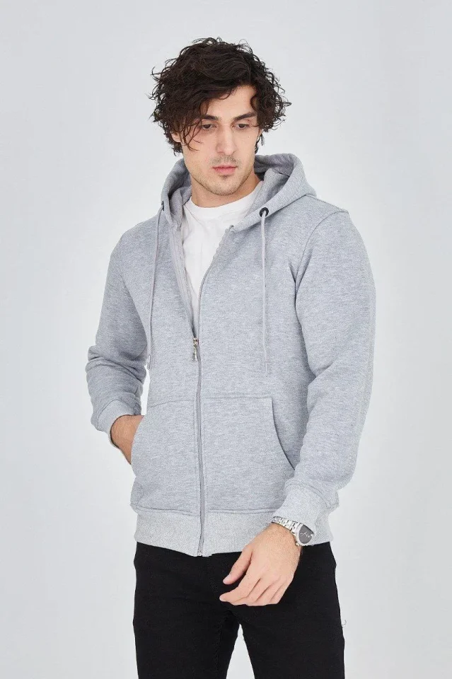 Erkek Kapüşonlu Düz Fermuarlı Hırka – Gri