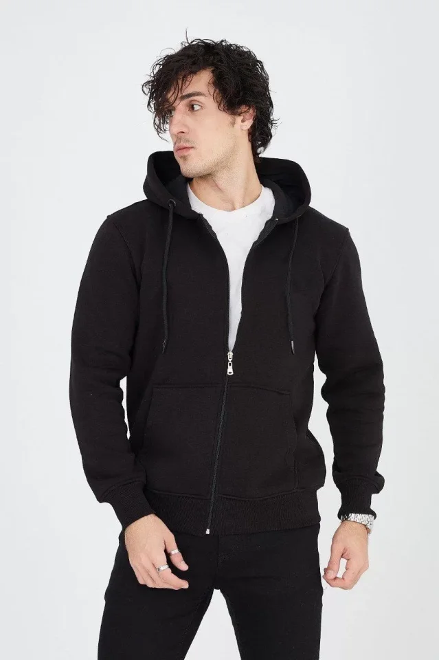 Erkek Kapüşonlu Düz Fermuarlı Hırka – Siyah