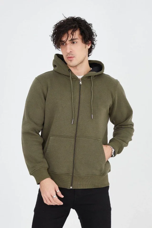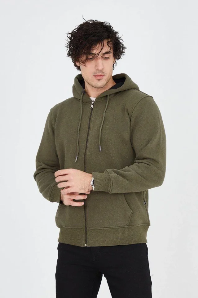 Erkek Kapüşonlu Düz Fermuarlı Hırka – Yeşil